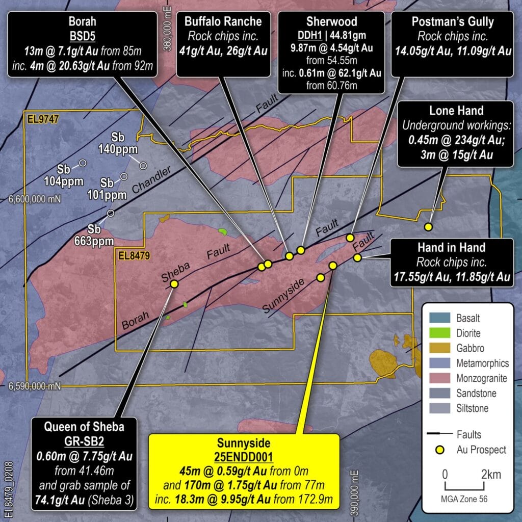 - 170m @ 1.75g/t Au from 77m, incl. 18.3m @ 9.95g/t Au from 172.9m (25ENDD001)